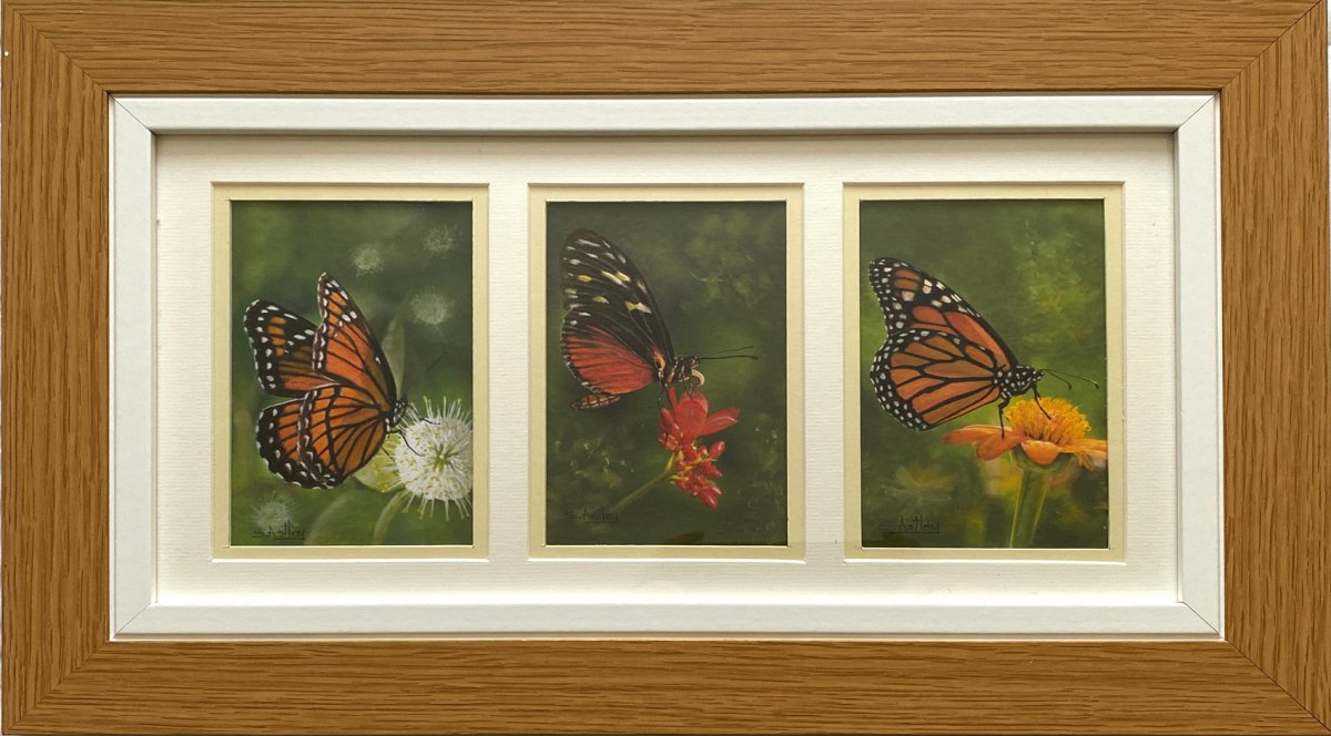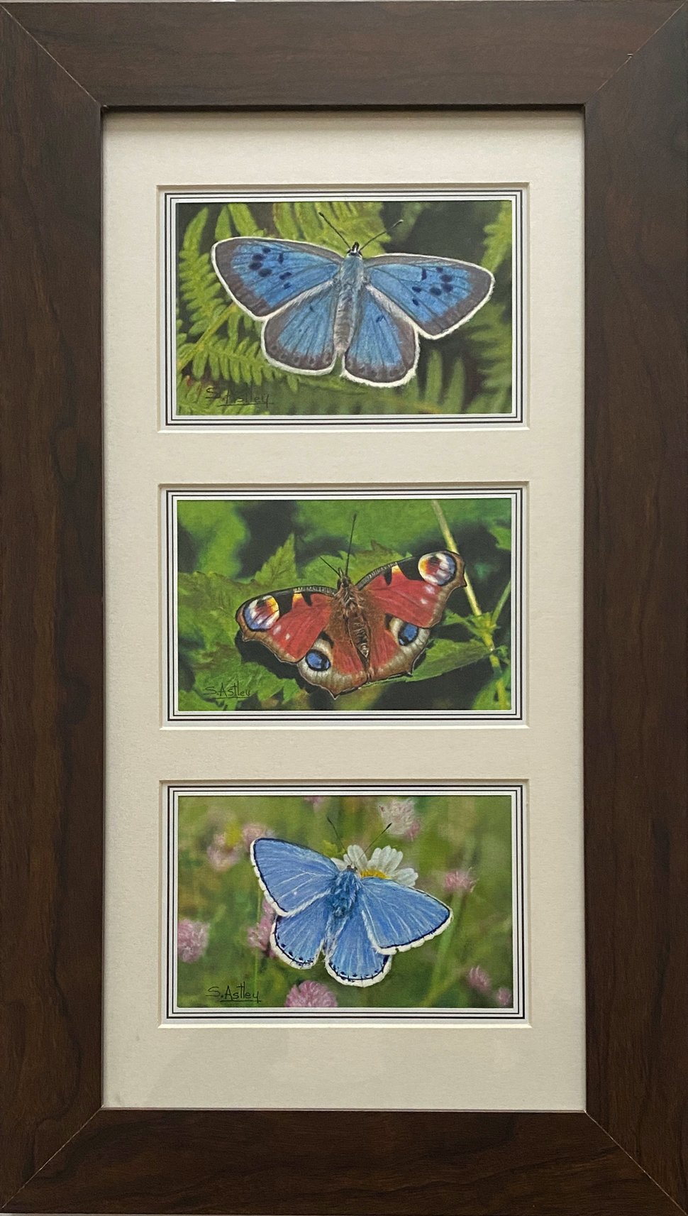 A collection of 3 individualy signed original pastel, watercolour, ink and gouache pretty butterfly artworks